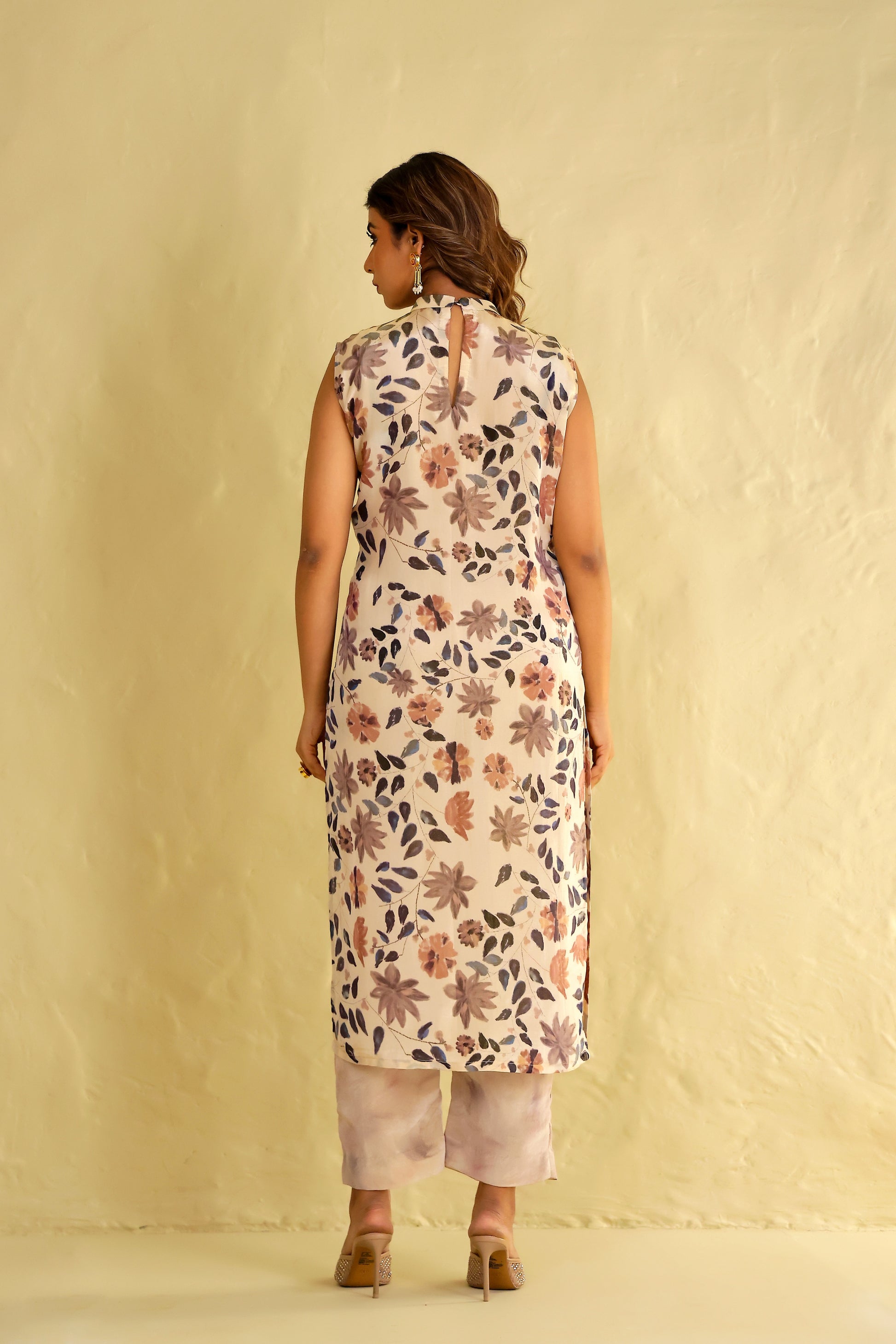 A contemporary take on effortless festive dressing, this sleeveless high-neck kurta features our signature bold floral print in rich autumn tones. The straight silhouette offers a relaxed yet refined fit, enhanced with side slits for easy movement and a flattering fall.
