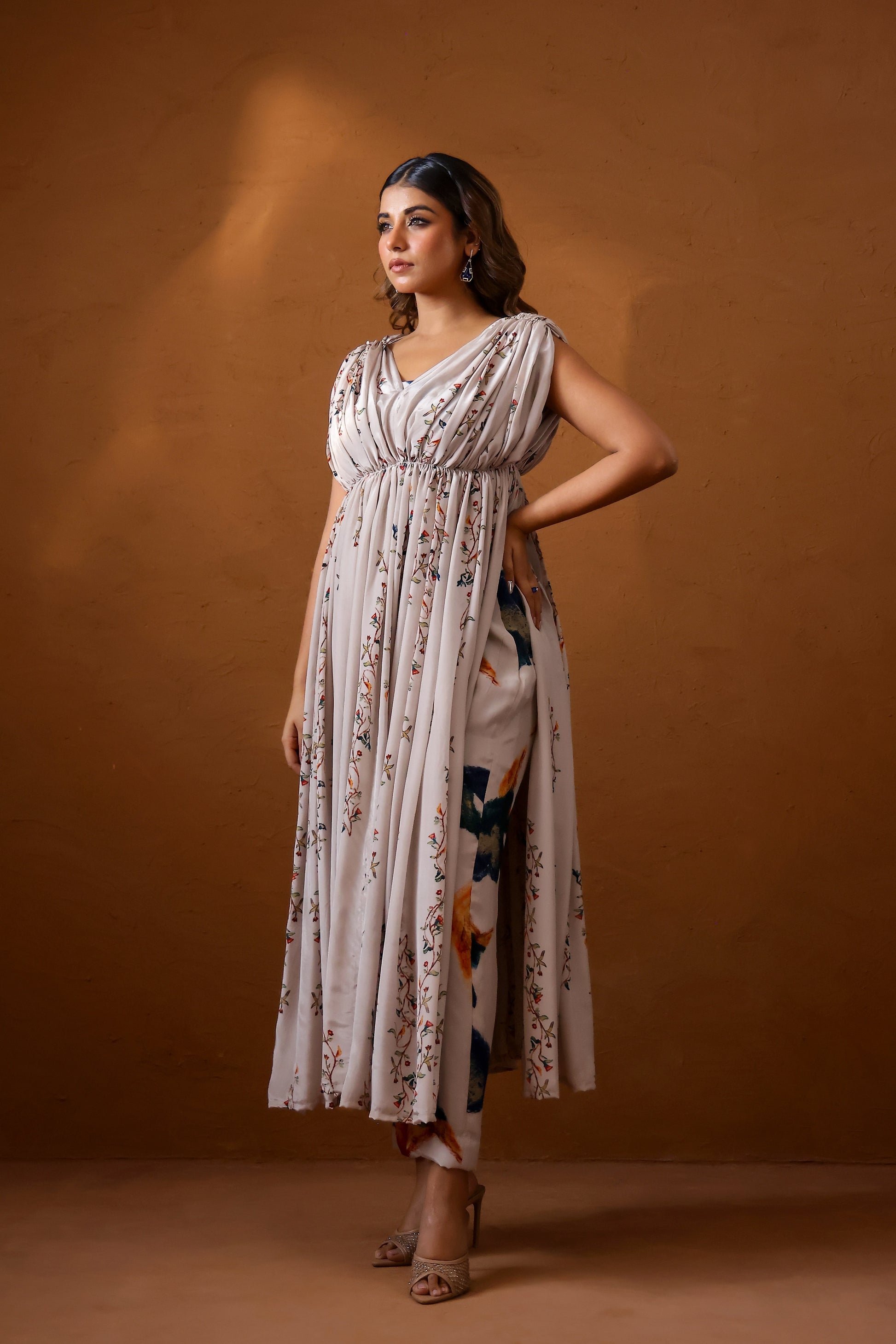 Grace meets fluidity in this beautifully draped overlay dress, designed to bring movement, charm, and effortless sophistication to your wardrobe. Crafted in a soft crepe, the piece features an intricately gathered bodice that creates a flattering, free-flowing silhouette. Delicate botanical motifs trail across the overlay, adding a touch of poetic elegance.