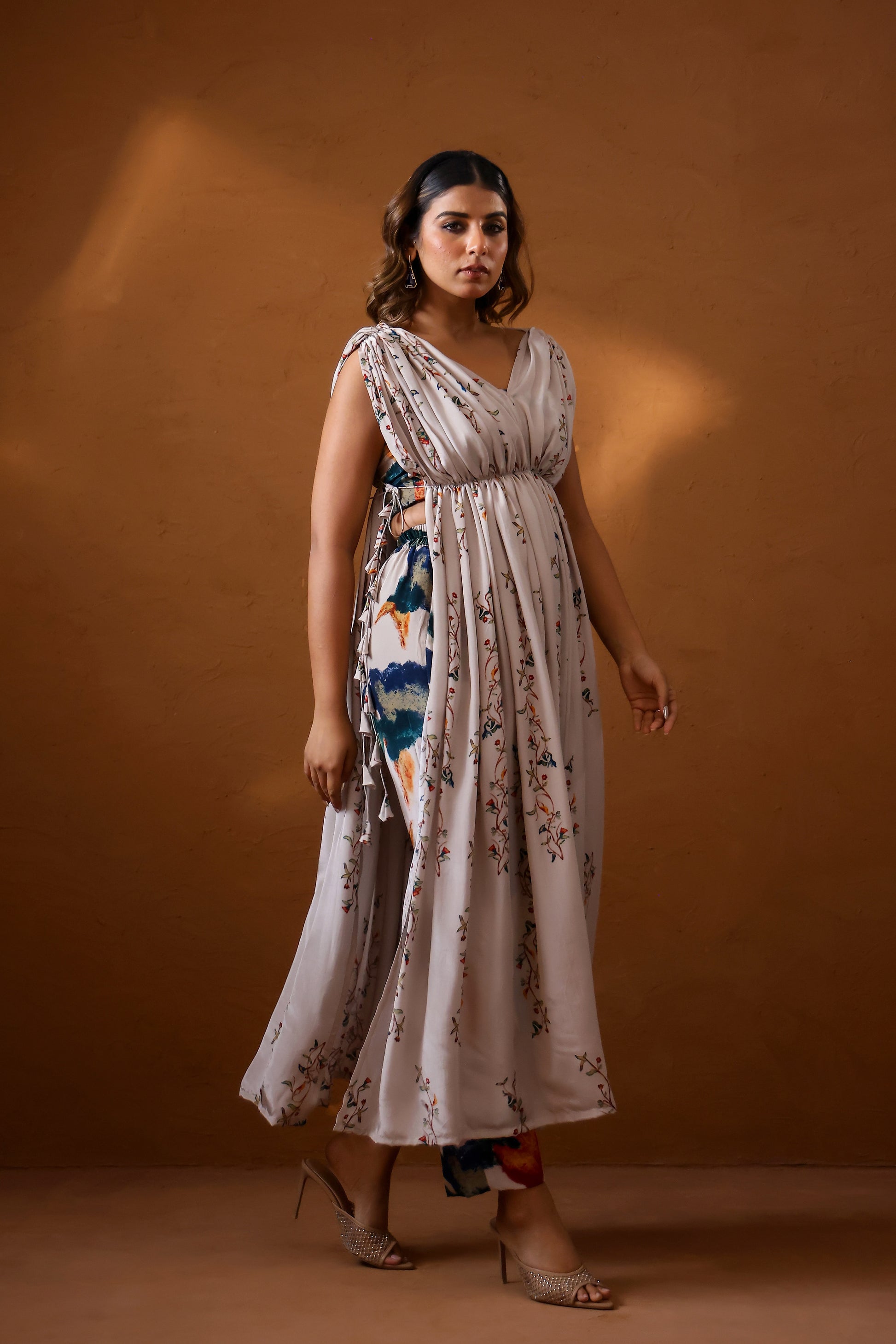 A peek of abstract painterly prints underneath lends a modern contrast, making this ensemble a perfect blend of tradition-inspired artistry and contemporary design. The side-tie details enhance the fit while preserving the airy, goddess-like drape.