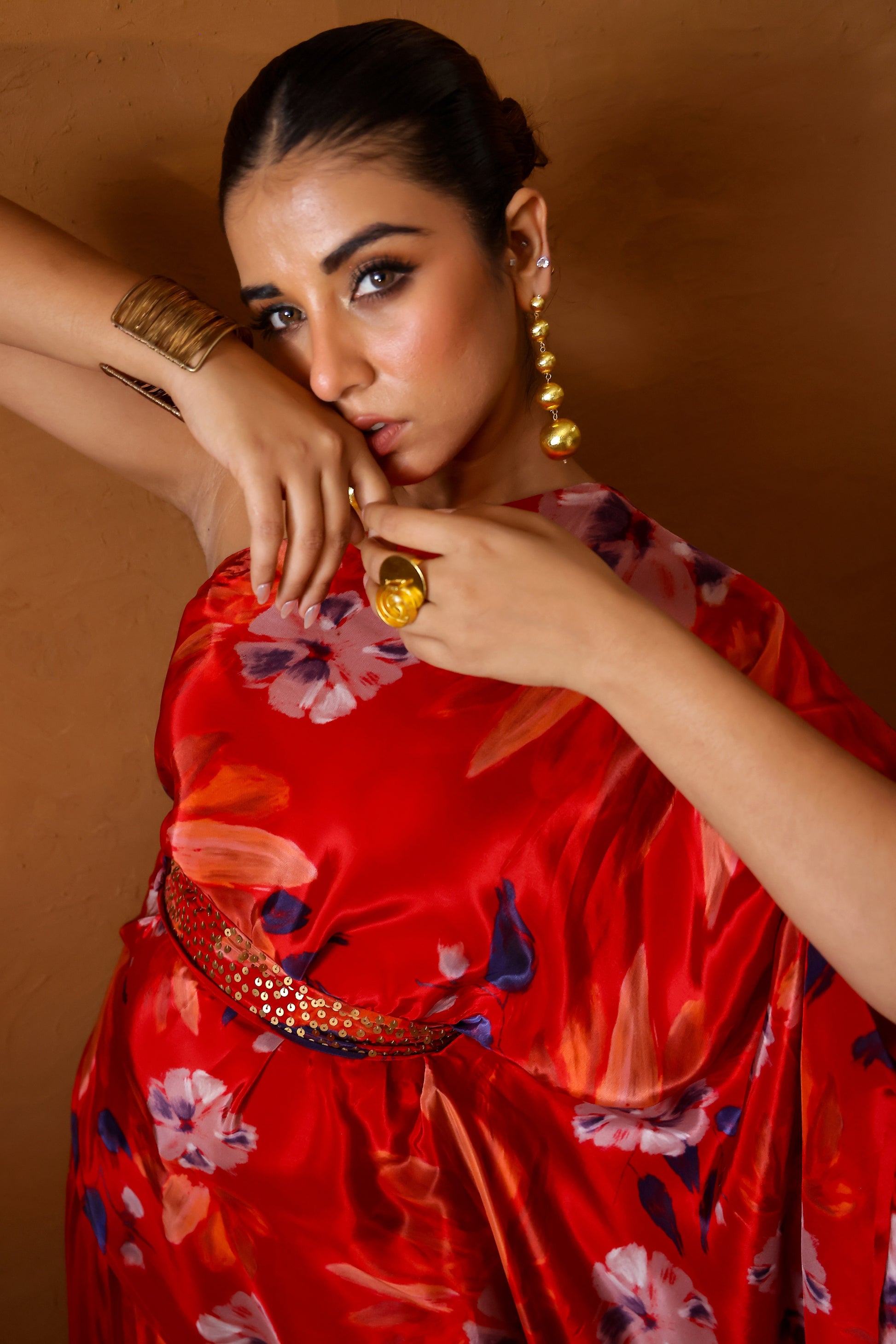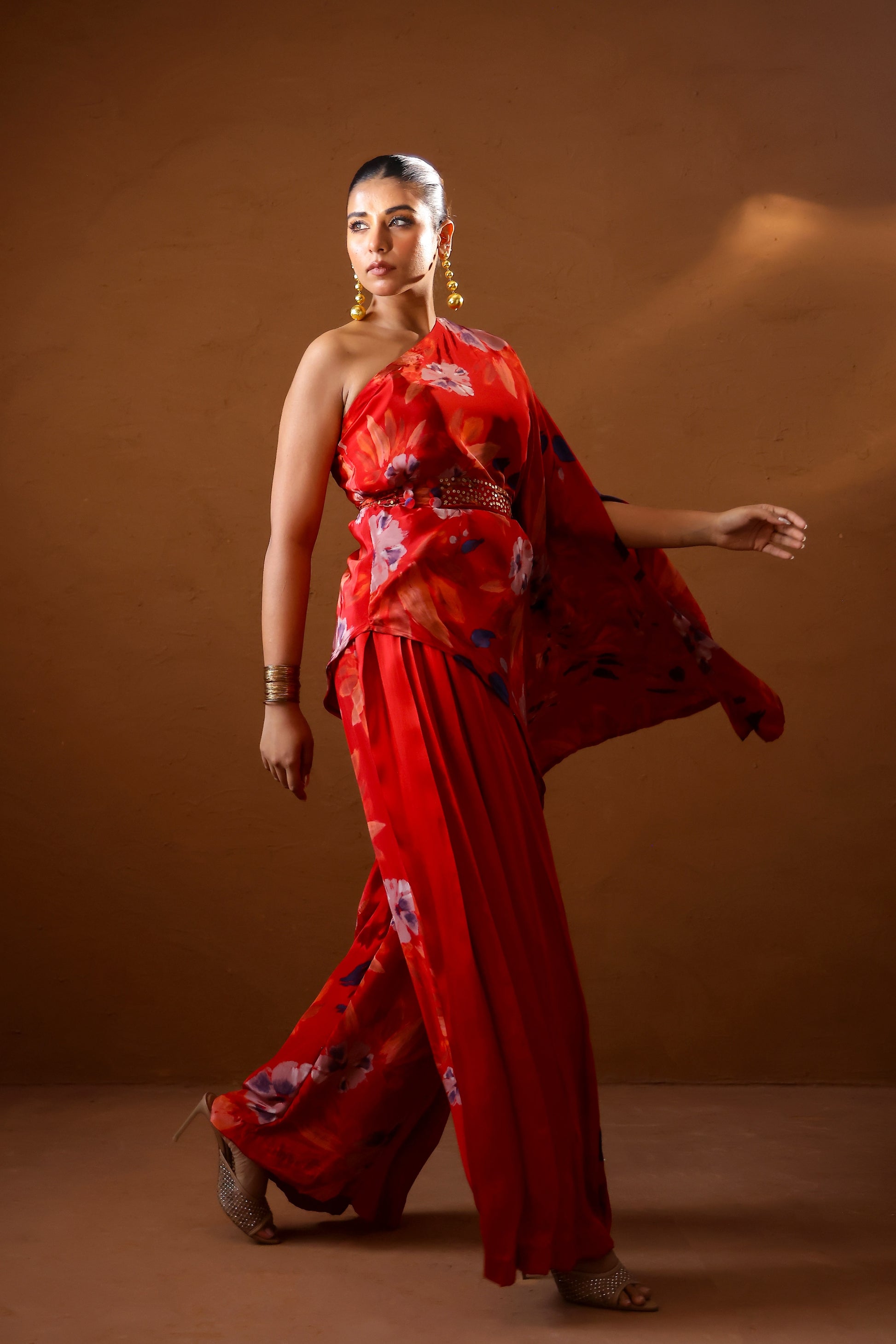This asymmetric ensemble is crafted in luxurious crepe with jewel-toned charm. Featuring a closed-collar neckline, intricate hand-embellished floral belt, it pairs effortlessly with side-pleated contrasting pants. A sophisticated yet statement-making look for contemporary celebrations.