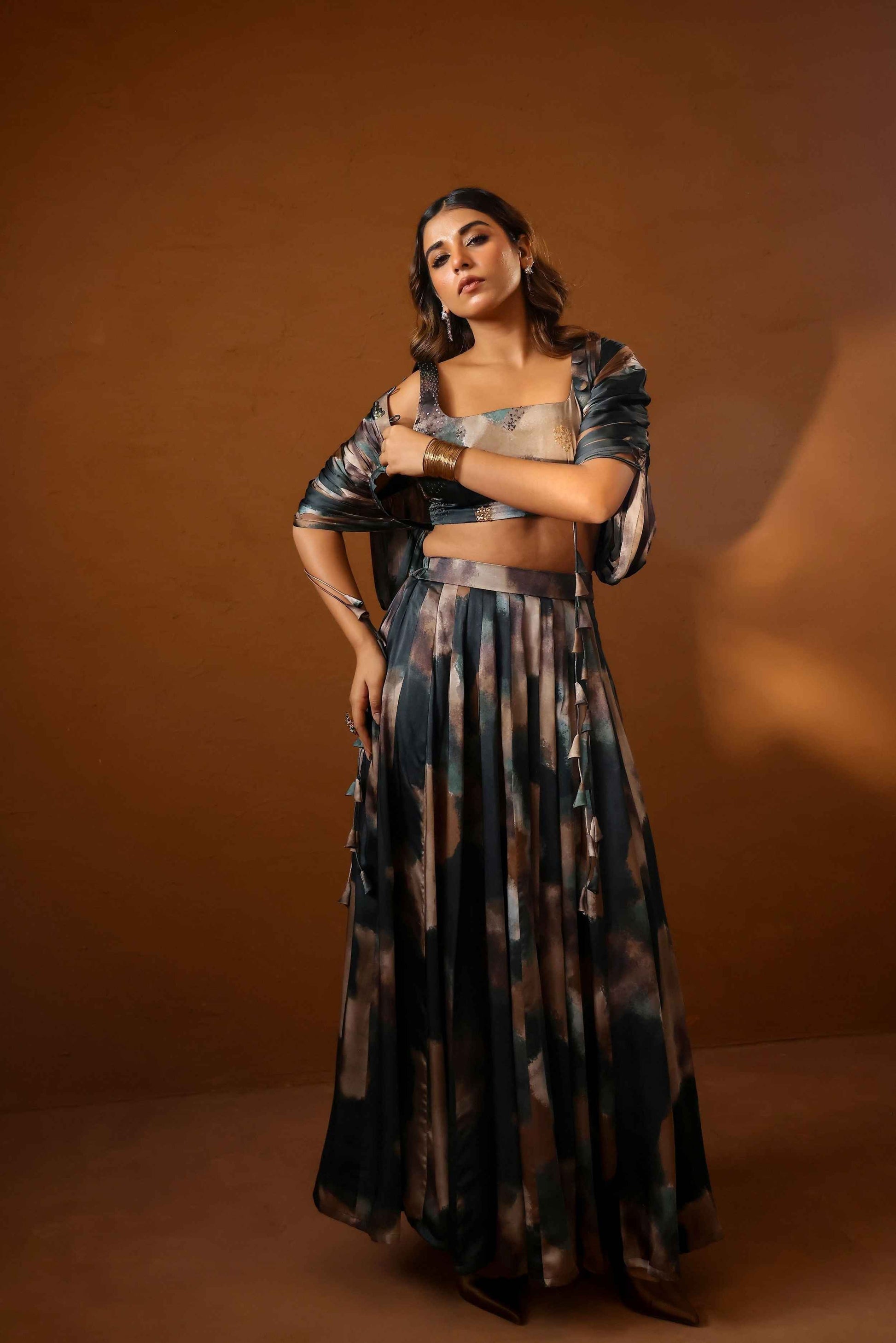 Paired with a high-waist lehenga skirt in a matching abstract print, the silhouette flows beautifully with every step, making it ideal for festive occasions, cocktail nights, or destination celebrations. The earthy colour palette lends a grounded yet luxurious feel—effortlessly elegant, endlessly wearable.